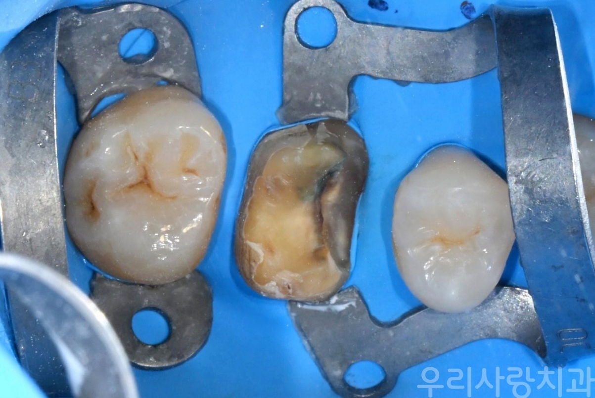 환자분께 현재 상태와 2차 충치의 가능성을 충분히 설명해 드린 후, 조심스럽게 기존 금니를 제거했습니다. 겉으로는 멀쩡해 보였던 치아 내부는 어떤 상태였을까요?