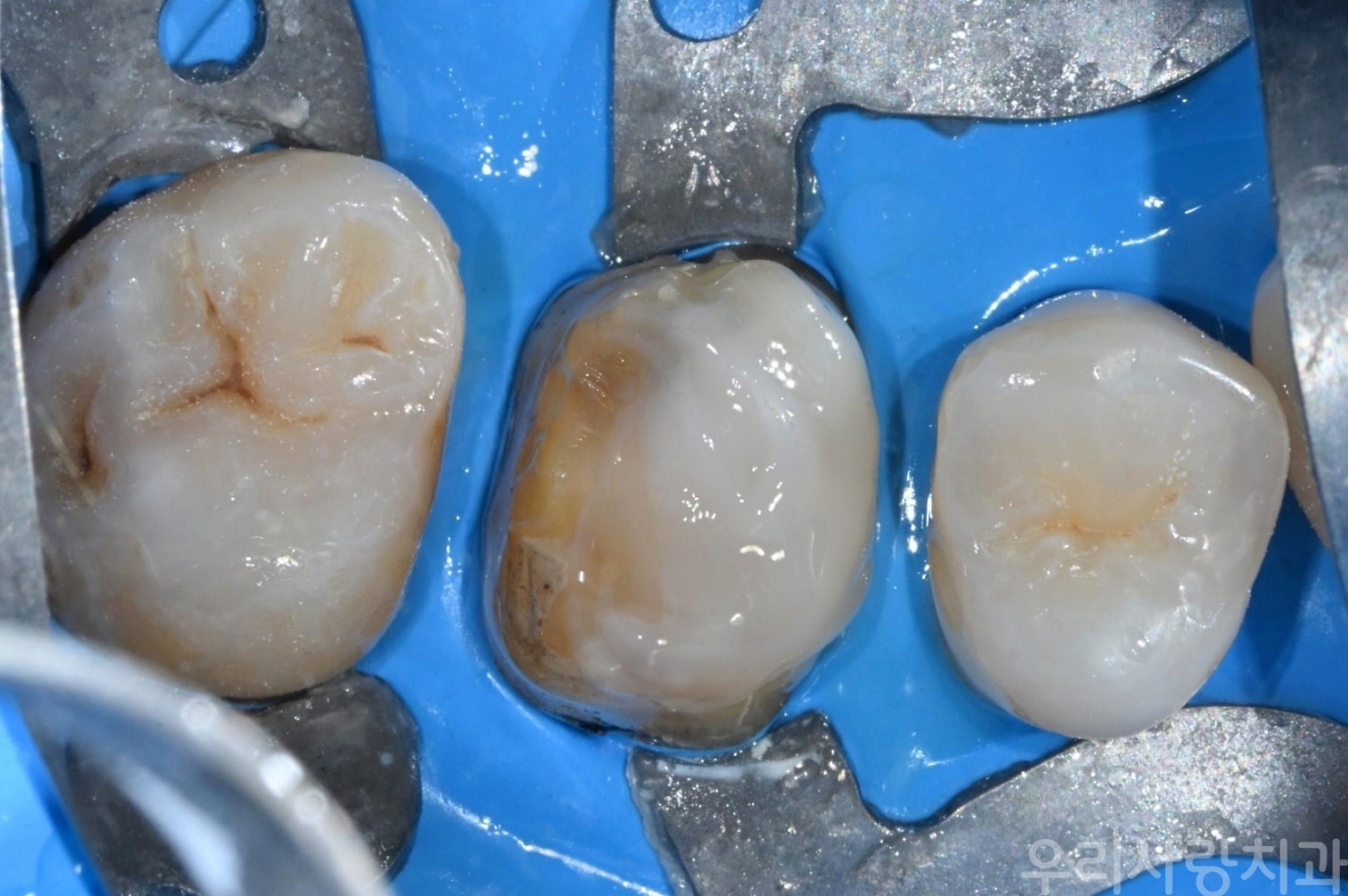 ▲ 러버댐을 장착하여 침과 습기를 완벽히 차단한 상태